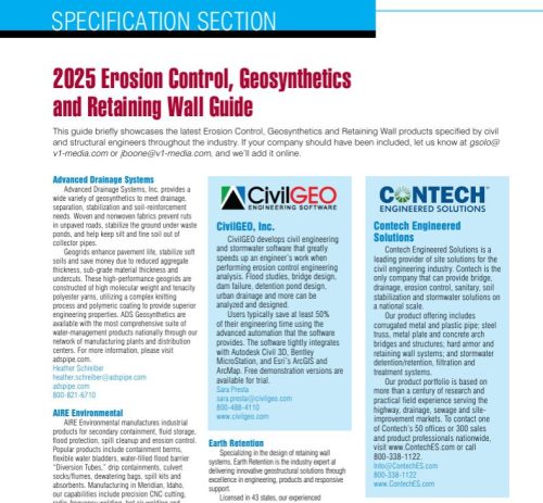 This guide briefly showcases the latest Erosion Control, Geosynthetics and Retaining Wall products specified by civil and structural engineers throughout the industry. If your company should have been included, let us know at gsolo@v1-media.com or jboone@v1-media.com, and we’ll add it online.