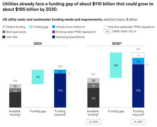 Across the United States, private and public water and wastewater utilities are underfunded. As critical water infrastructure ages, maintenance expenditures go up. Rising user costs (including for citizens) have been unable to close the funding gap. Although the Bipartisan Infrastructure Law (BIL) and other legislation provide funding to address this issue, our research shows the US water utility sector faced an estimated $110 billion funding gap in 2024 (nearly 60 percent of utilities’ overall spending), primarily driven by significant investments in aging infrastructure, operating expenses, and water-quality regulations (exhibit). By 2030, this gap could increase to approximately $194 billion.1