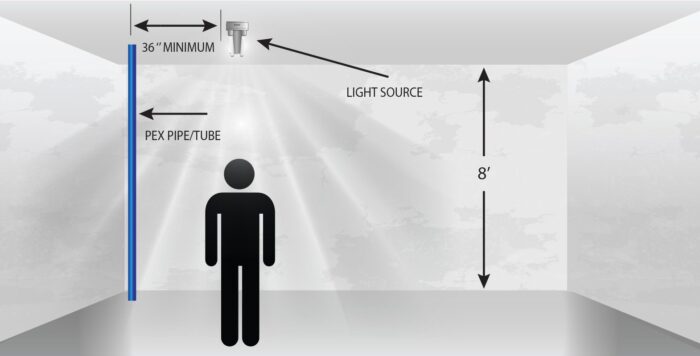 Recommended setback distance between artificial light source (non-LED) and PEX pipe/tubing in a typical residential or light commercial setting. Image courtesy of PPI.