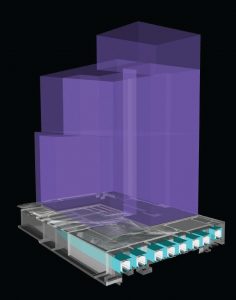 A partial 3D axonometric section shows the representation of an existing railyard with a structural platform built around it as well as the potential massing of a building above. All geometry was created within either AutoCAD or Revit and then imported into…
