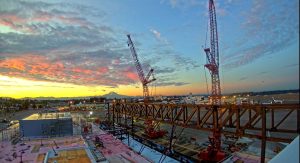 Todd Danielson, editorial director of Informed Infrastructure, interviews via webcam Ken Warren, program leader of the North Satellite Modernization project for the Seattle Tacoma International Airport.