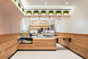 The IMC Architecture-designed café features top-of-the-line appliances, a Caesarstone counter, engineered wood and wallpaper wall finishes, white birch-colored wall tiles behind the counter, merchandise display shelving, diamond plate wainscoting and terrazzo…
