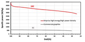 Power Density vs DoD%, Amprius Silicon Anode System vs. Commercial Graphite Anode System Amprius' cell is greater than 3x the discharge rate while sustaining the power delivery at lower depths of discharge (DoD%), resulting in extended usable battery capacity.…