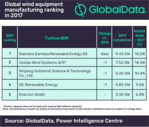 Siemens Gamesa Overtook Vestas Wind Systems as Top Wind Equipment Manufacturer in 2017, says GlobalData