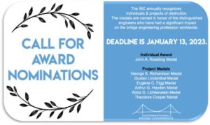 The IBC annually recognizes individuals and projects of distinction. The medals are named in honor of the distinguished engineers who have had a significant impact on the bridge engineering profession worldwide. Nominations are due the second week of January…