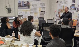 Photo Caption: Photo Caption: Vince Myers (standing), co-founding principal and president of DIGroup Architecture, shares his insights during a portfolio review with students from Kean University regarding inclusive design and architectural excellence –…