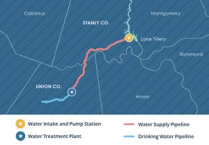 A high-level overview of the Yadkin Regional Water Supply Project through south-central North Carolina. The intake and pump station are in Norwood, the water-treatment plant is near Unionville, and the drinking-water pipeline connects to Union County’s existing…