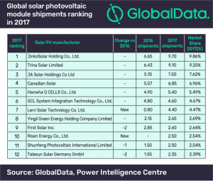 JinkoSolar Holding was the leading company for global solar photovoltaic (PV) module shipments in 2017. The company had shipments of 9.7 gigawatts (GW) of PV modules compared to Trina Solar’s 9.1 GW, keeping its rival in second place, according to GlobalData,…