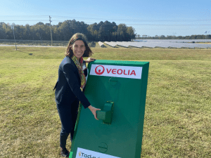 Julie Angulo, COO, Environmental Solutions and Services, Veolia North America “flipping the switch” on the 5-megawatt solar panel installation. Image courtesy of VEOLIA. October 9 Event Showcased Sustainability Initiatives Including “Flipping…