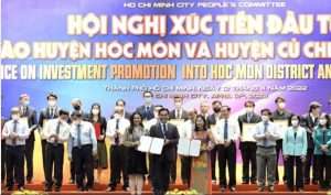 Ms Nina Yang, CEO of Surbana Jurong - SJ CityGlobal (centre left), and Mr Lee Chong Min, Chairman of CMIA Capital Partners (centre) receiving the signed Memorandum of Understanding from Ms Pham Thi Thanh Hien, Chairwoman of the Ho Chi Minh City, Cu Chi District…