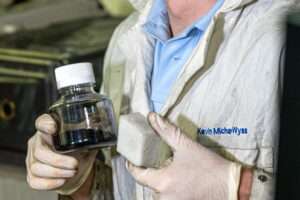 Rice University graduate student Kevin Wyss holds a vial of graphene and samples of the graphene-reinforced polyurethane made by the Ford Motor Company. Ford collaborated with a Rice lab to recycle plastic from end-of-life vehicles into graphene through flash…