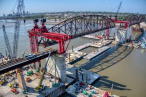 View of job site. Photo credit: Walsh Construction and Trey Cambern Photography Rail service restored over the mighty Mississippi River, for decades…