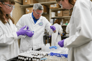 Eric Kleiner, center, sorts samples for experimentation as part of drinking water and PFAS research at the U.S. Environmental Protection Agency Center For Environmental Solutions and Emergency Response, Thursday, Feb. 16, 2023, in Cincinnati. The Environmental…