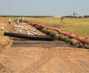 A photo illustrates stormwater-management construction in progress, including the lightweight aggregate subbase, perforated pipe (bedded in lightweight aggregate), and placement of the geogrid capped with the vegetative filter media. (Expanded Shale, Clay…